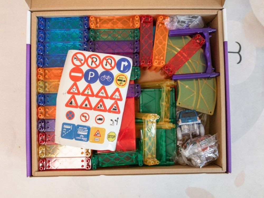 A készlet számos színes elemet tartalmaz utak, hidak és különböző pályák megépítéséhez, amelyeken a mellékelt két kisautó közlekedhet. A háromszögek, négyzetek, téglalapok, íves és lejtős elemek, tartóoszlopok és közlekedési táblák segítségével akár többszintes építmények is létrehozhatók. A gyerekek saját kis várost, úthálózatot vagy kalandos pályát tervezhetnek, miközben fejlődik térbeli gondolkodásuk és problémamegoldó képességük.