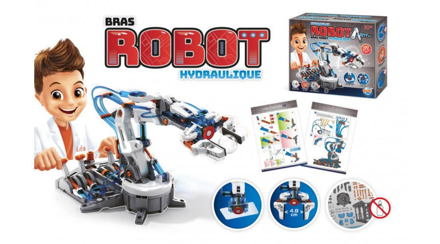 Építsd meg saját hidraulikus robotkarodat – vízzel működtetve! A Buki France Hidraulikus robotkar egy valódi mérnöki kihívás: az összeszereelt csuklós robotkart vízzel töltött hidraulikus rendszer hajtja, és 6 karral irányítható minden irányban. Fogóval vagy tapadókoronggal akár 50 g súlyú tárgyakat is képes emelni. Elem nem szükséges! 10 éves kortól.