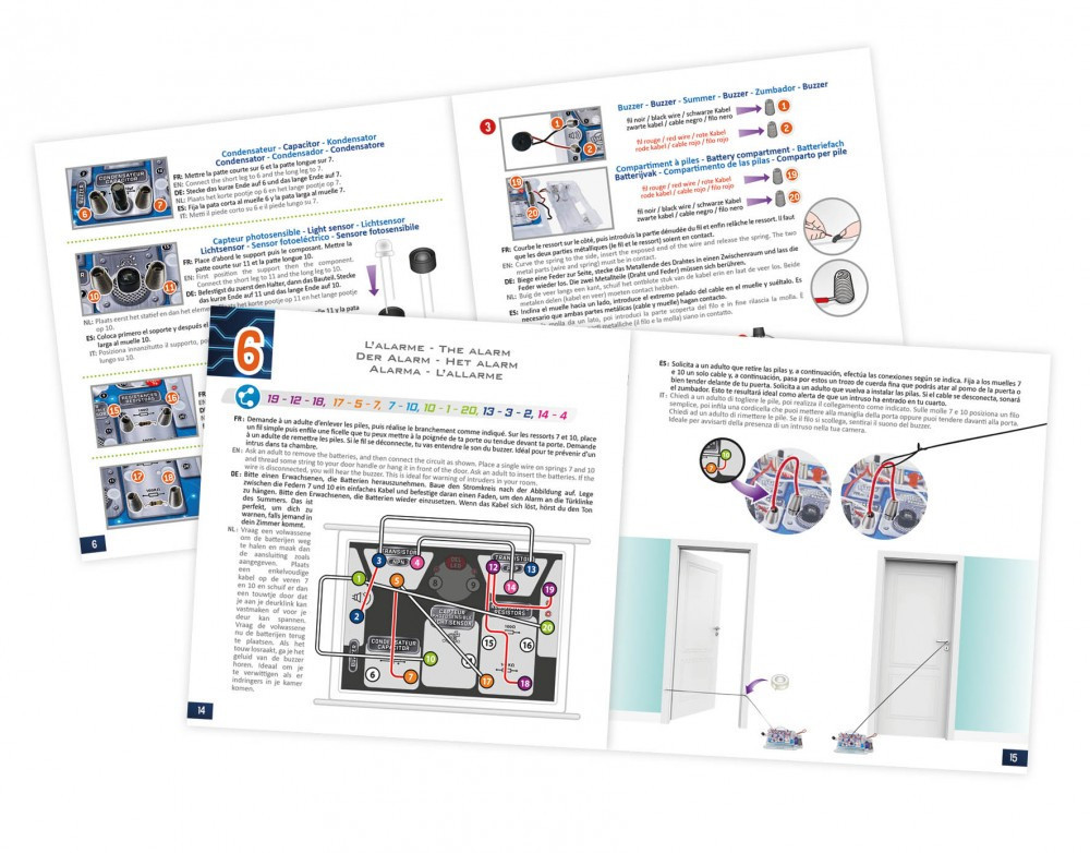 Míg más készletek csak imitálják az elektronikát, ez a szett igazi áramköri elemeket ad a gyerekek kezébe. A doboz tartalma: 1 kapcsolótábla, 1 perforált kartonlap, 7 piros és 7 fehér kábel, 20 rugó, 1 elemtartó, 1 buzzer, 1 LED, 1 NPN tranzisztor, 1 PNP tranzisztor, 1 kondenzátor, 1 fényérzékelő és tartója, 2 ellenállás, valamint illusztrált útmutató. A rugós csatlakozási rendszernek köszönhetően az összeszerelés biztonságos és egyszerű.
