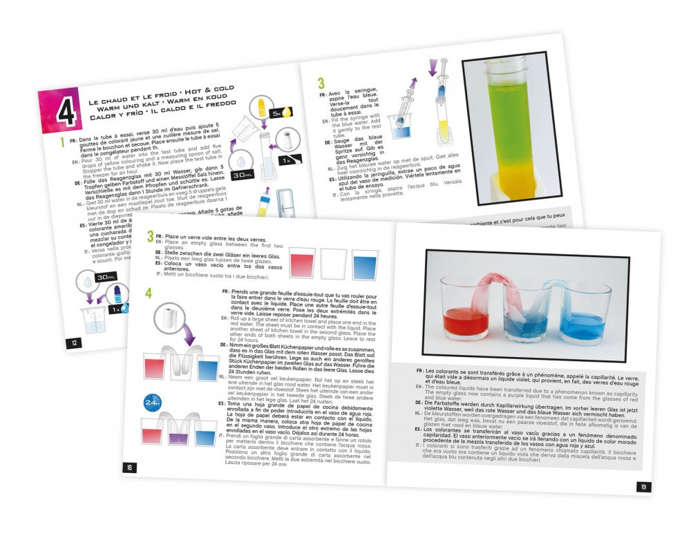 A 6 aktivitás között szerepel a tűzijátékeffekt, a lávafáklya, a varázsleves, a hideg és meleg víz szétválasztása két rétegbe, a sűrűségi koktél és a színátadás kísérlete. Minden egyes kísérlet azonnali, látványos eredménnyel jár – pont amennyit egy 8 éves gyerek elvár egy igazán klassz tudományos aktivitástól.