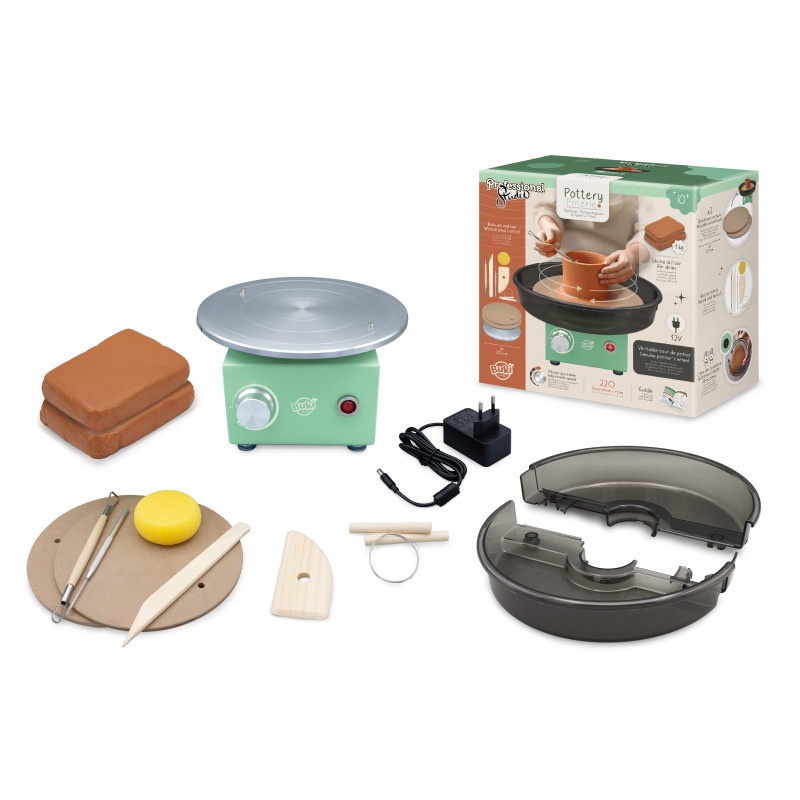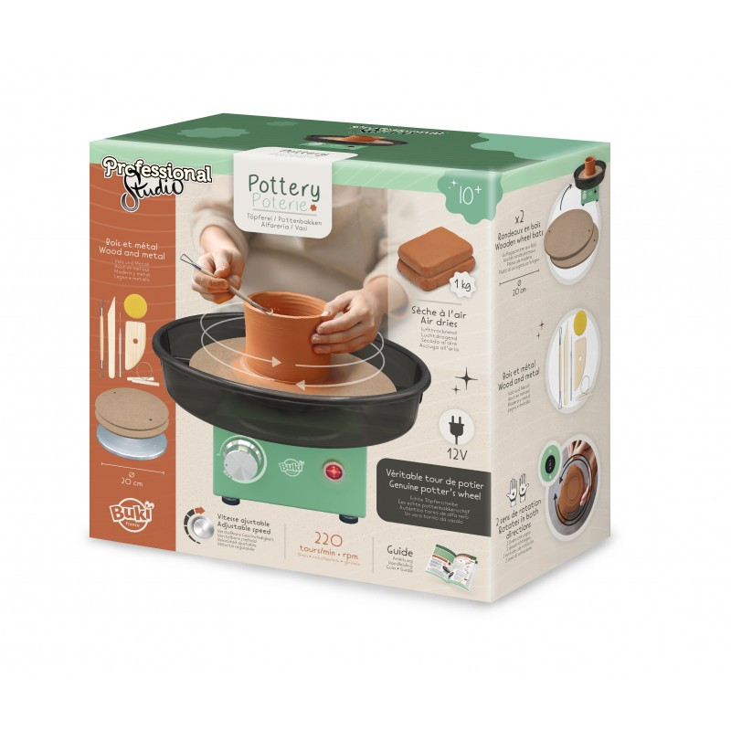 Valódi fazekaskorong gyerekeknek és felnőtteknek – 220 fordulat/perc sebességgel, 20 cm-es fém tárcsával! A Buki France Professional Studio Fazekasság Expert szett a komolyabb fazekasság első lépése: kétirányú forgás (bal- és jobbkezeseknek egyaránt), levehető fröccsenővédő és 2 agyagtartó lap is mellékelt. 10 éves kortól, tökéletes ajándék alkotni vágyó gyerekeknek és felnőtteknek!
