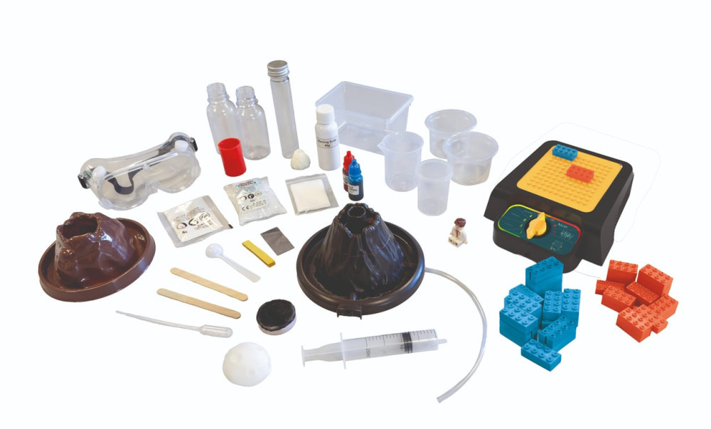 Tartalmaz: volkanikus kellékek, vegyi anyagok (nátrium-bikarbonát, nátrium-acetát, festékek, slime-por), edények, szivacs, mérőkanál, szemüveg, vortex-cső, jégminta-öntőforma, pH-papír, illusztrált útmutató